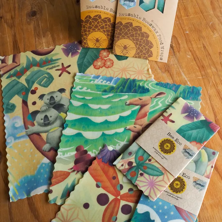 繰り返し洗って使える!地球に優しいみつろうラップ。余った野菜を包んだり、器のフタに。カラフルな柄でキッチンを楽しくしながら「もったいない」を減らします