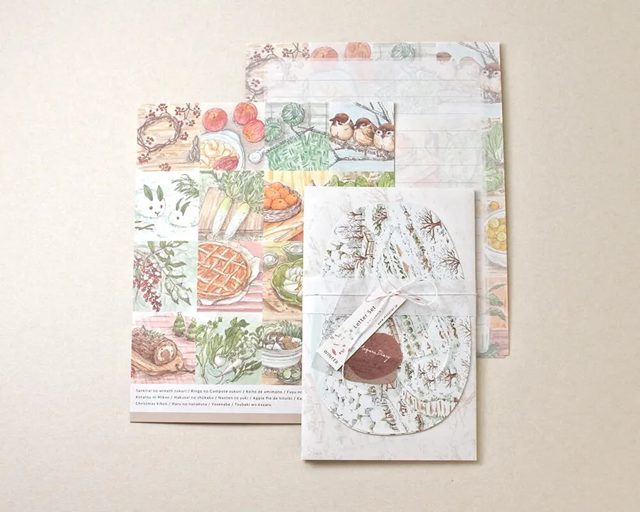 季節を感じるひとコマを散りばめた季節感あふれるレターセットです。 優しい色合いで仕上げた絵日記風のイラストは、じっくり眺めても季節の雰囲気を楽しめます。 便箋はA5サイズよりひとまわり小さいサイズです。 便箋の他におまけのカードが付いていて、そのまま飾りのカードとして封入したり裏面にメッセージを綴っても素敵です。 やわらかな曲線を使った封筒には、季節の風景がうっすらと入っています。 《内容量》便箋8枚、カード2枚、封筒・封シール各2枚入 ◆バリエーション  《季節:春》 れんげ草やふきのとう、さくら、ツバメの親子などのイラスト 《季節:夏》 ひまわりや金魚、スイカなどのイラスト 《季節:秋》 紅葉や赤とんぼ、柿の収穫などのイラスト 《季節:冬》 リースづくりや雪うさぎ、白菜の収穫などのイラスト