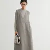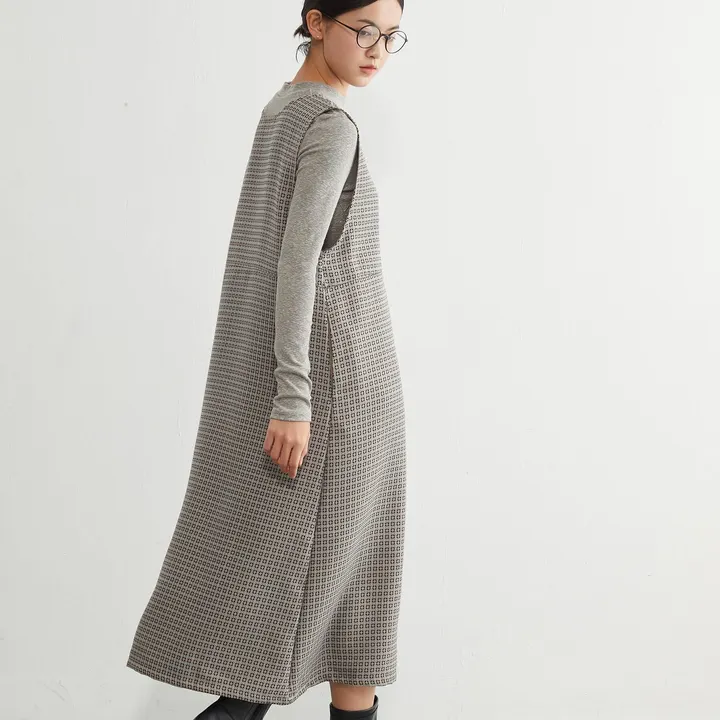 KNGT624・小紋柄風ジャカード織りVネックジャンパースカートポケット付き GRAY-L