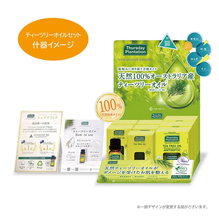 ティーツリーオイル10mlと50mlの専用什器付きセットです。 什器は、その他のティーツリー商品を展示することも可能です。  ※送料無料  ※テスター付き ------------------------------------------- 〔セット内容〕 ◎ティーツリーオイル(10ml) × 5個 ◎ティーツリーオイル(50ml) × 3個 *ティーツリー専用紙什器   × 1台 *テスター(10mlサイズ)   × 1個 *ミニPOP(A5サイズ)    × 1個 ------------------------------------------- ■専用什器サイズ:W180×D130×H280mm ■POPサイズ:A5(148×210mm)