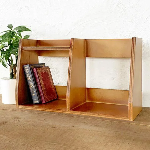 北海道 旭川市の自社工場で製作しています 文庫本やコミックスなどの背の低い本と インテリア雑誌などの背の高い本を一緒に整理することができる おしゃれな本立て。 棚の上に小物を飾ったり、メガネ置き場にしても便利。 ■商品サイズ 約 横幅430×奥行155×高さ262mm (板の厚みなどで多少の誤差が出る場合があります) ■材質:合板