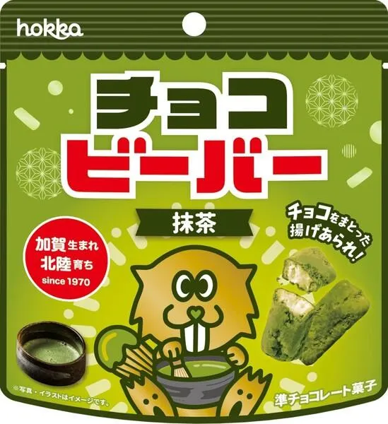 抹茶チョコをまとった揚げあられビーバーです。 サクサクまろやかな口溶けは一度食べるとやみつきになります。