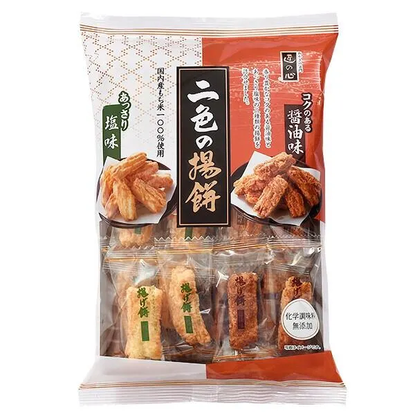 香り豊かなコクのある醤油味とあっさり塩味の二種類の揚餅を詰合せ。 化学調味料は使用せずに、素材の旨味にこだわりました。