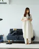 3重ガーゼでできたワンピースです。 パジャマ、部屋着、お風呂上がり、台所で、さまざまにお使いいただけるルームウェアとして、ちょっとそこまでお出かけするワンマイルウェアとして、日常生活の多くの場面において活躍してくれるワンピースをつくりました。 夏はこれ1枚ですずしく、秋冬は重ね着コーデであったかくお召しになれます。 部屋干しでも乾きやすいので、それほどたくさんの洗い替えも必要ありません。 いつもどおりのお洗濯方法で遠慮なく洗えます。 シワも気になりづらい生地なので、ぜひ気兼ねなくいろんなシーンでお使いください。 身幅は同じ、身丈だけがサイズ違いで、SとMがあります。身長やお好みの丈感に合わせてお選びください。 マタニティの方などにもオススメです。抱っこされているお子さんにとっても、気持ちのいい肌触りです。