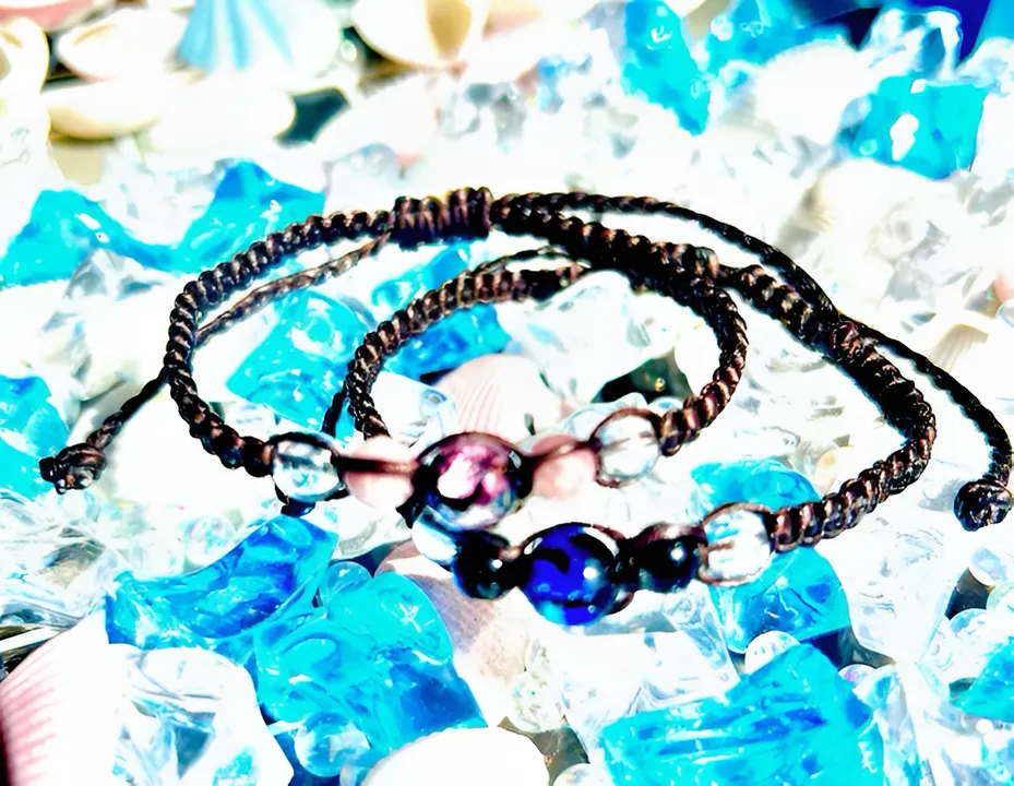 【海のカケラ】 ホタルガラス ハンドメイド編み込みペアブレスレット