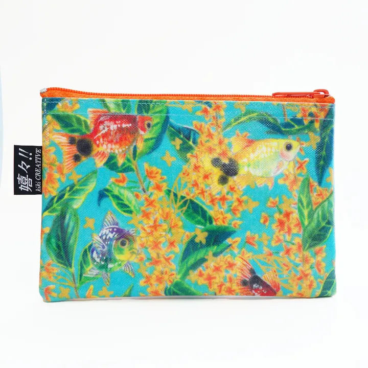 飯塚 月のアートワークを使用した手のひらサイズのコンパクトなミニポーチです。 ちょっとしたメイク用品やお薬、小物などを収納するのに便利です。 外側はビニールコーティングされていて、水や汚れに強く(完全防水ではありません。) アウトドアシーンにもお勧めです。 飯塚 月 2014年から蜂をテーマにした作品を描き始める。 2017年頃より様々なテーマに取り組み、 アトリエで蜂や出目金、ベタを飼いはじめ、 最近は極細ボールペンや色鉛筆を使い金魚を描いている。 「私の住む町には、海も山も田んぼも川もあります。 豊かな自然と綺麗な水、 様々な生き物に囲まれて育ちました。 人と話すことが苦手だった私にとって、 自然や生き物と触れ合う時間はとても大切なもので、 それらを描くことは 私のコミュニケーション方法のひとつでもありました。 植物や虫や魚との触れ合いを通じ人との関わりを広げ、 また絵の中を花や 植物と共に自由に泳ぐ魚たちのように、 私も自由に様々なところへ行きたいという気持ちで金魚をメインモチーフに描いています。 ● サイズ:W150 × H95mm ● マチなし  ● 11 号帆布  ● 表裏同柄   ● 表面ビニール加工、撥水(防水ではありません) お使いのデバイスにより商品写真のお色が実際と異なることがあります。ご了承ください。