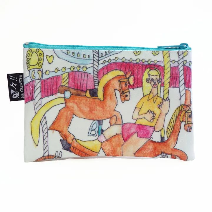 筧 純爾のアートワークを使用した手のひらサイズのコンパクトなミニポーチです。 ちょっとしたメイク用品やお薬、小物などを収納するのに便利です。 外側はビニールコーティングされていて、水や汚れに強く(完全防水ではありません。) アウトドアシーンにもお勧めです。 筧 純爾 1976年生まれ。ボールペンで迷いなく人物を足先から描きはじめる。 水彩色鉛筆を使った、独特の土っぽくにじんだ雰囲気、 どこか欧米風の人物と余白を活かした構図が特徴的。 子供の頃アメリカに住んでいたことがあるという彼は、 作品中やタイトルにも英語や英語風の造語を使うことがよくある。 普段は明るく少しスピリチュアルに、 筋肉の話から天使と悪魔の話まで幅広い世界の不思議な話を聞かせてくれる。 ● サイズ:W150 × H95mm ● マチなし  ● 11 号帆布  ● 表裏同柄   ● 表面ビニール加工、撥水(防水ではありません) お使いのデバイスにより商品写真のお色が実際と異なることがあります。ご了承ください。