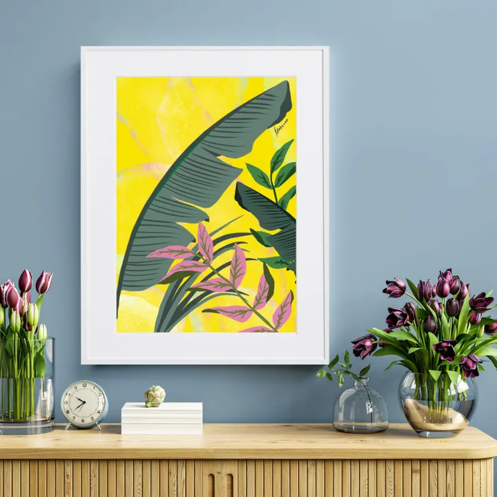 アーティスト -PROFILE- MOMOCO(モモコ) 「色」をこよなく愛する画家、ライブペインター。 躍動感あるアートにも関わらず、服を一切汚さず短時間で音楽と同時に描き上げる。そのパフォーマンスと巨大アートは観る人を魅了する。 前職は某有名ファッションブランドにてデザイナーとして活躍。その経験の中で養われた「色とデザイン」の絶妙なバランスを活かしつつ、トレンドを取り入れ進化し続けるアートを目指す!国内外問わず、精力的にアートと向き合い発信を続けている。 【作品について】 水をやる必要がない!観葉植物を壁に 目が冴える黄色がおしゃれでシンプルな作品は、アート購入初心者さんにもおすすめ ナチュラルな部屋やBOHOインテリアが好きな人にも 作品名:アーバンマジック Ⅲ 手法:デジタル、イラスト ペーパー:高品質半光沢紙 マットカラー:白 マット*:DXホワイト芯 100%バージンパルプ/PH7・中性紙(2mm厚) ※全てのアートにマットがつきます フレームカラー:黒、白、無垢(3種類から選択) ※マット付のため通常とはフレームサイズが異なる規格となります。 【マット*とは?】 アートポスターの周りに挟んだ厚紙の事。 マットを使わない時に比べ余白により広がりが生まれ、作品の新たな一面を引き出せ作品の見栄えがグッと良くなります。また、額縁のガラス面と作品が直接触れたままにしておくと、くっついて作品を傷つけることがあります。マットを使用することでガラスと作品の間に空間ができ、作品を保護することができます。ブランドコンセプトにより全てのアートにマットがつきます。 ー ファッションのようにアートを ー 私達が掲げるコンセプトです! 毎日着替えるファッションの様に、アートも気軽に飾り変えて欲しい... 一旦飾り終えたアートにも光を当ててほしい... ポスター単体、またはリピートで中身だけのポスターを購入された方に"専用のハンガー"をセットでお届け。 「今までに無い!新しいアートの飾り方を提案」 飾る事がなくなった前のアートをハンガーにかけて洋服と一緒にかけてもらう。 その日の気分や、モチベーションですぐに取り換えられる様に。 もちろん、魅せる収納としても今までにないおすすめの飾り方です。