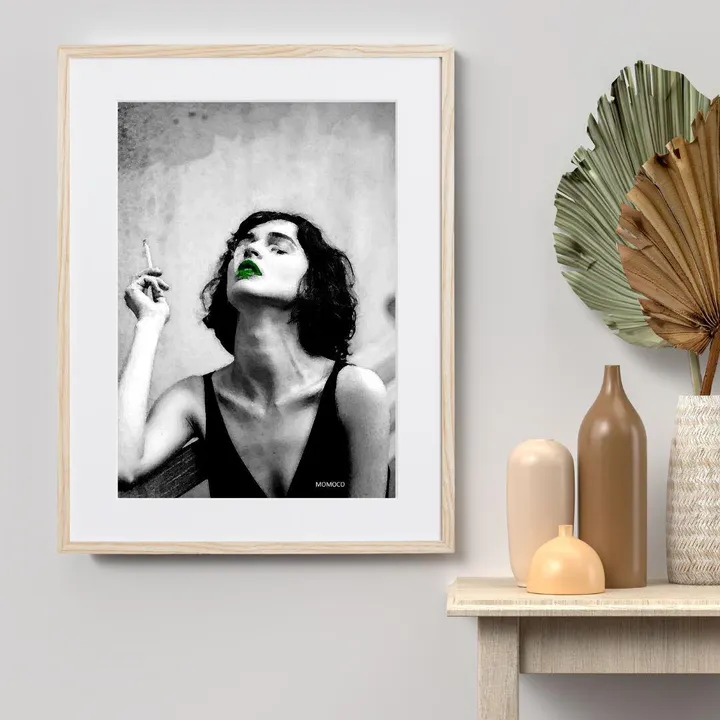 アーティスト -PROFILE- MOMOCO(モモコ) 「色」をこよなく愛する画家、ライブペインター。 躍動感あるアートにも関わらず、服を一切汚さず短時間で音楽と同時に描き上げる。そのパフォーマンスと巨大アートは観る人を魅了する。 前職は某有名ファッションブランドにてデザイナーとして活躍。その経験の中で養われた「色とデザイン」の絶妙なバランスを活かしつつ、トレンドを取り入れ進化し続けるアートを目指す!国内外問わず、精力的にアートと向き合い発信を続けている。 【作品について】 白黒に浮かび上がる緑色の唇がアクセント!クールな女性が印象的 スタイリッシュで都会的なインテリアにおすすめ 作品名:monster lips 手法:デジタル、イラスト ペーパー:高品質半光沢紙 マットカラー:白 マット*:DXホワイト芯 100%バージンパルプ/PH7・中性紙(2mm厚) ※全てのアートにマットがつきます フレームカラー:黒、白、無垢(3種類から選択) ※マット付のため通常とはフレームサイズが異なる規格となります。 【マット*とは?】 アートポスターの周りに挟んだ厚紙の事。 マットを使わない時に比べ余白により広がりが生まれ、作品の新たな一面を引き出せ作品の見栄えがグッと良くなります。また、額縁のガラス面と作品が直接触れたままにしておくと、くっついて作品を傷つけることがあります。マットを使用することでガラスと作品の間に空間ができ、作品を保護することができます。ブランドコンセプトにより全てのアートにマットがつきます。 ー ファッションのようにアートを ー 私達が掲げるコンセプトです! 毎日着替えるファッションの様に、アートも気軽に飾り変えて欲しい... 一旦飾り終えたアートにも光を当ててほしい... ポスター単体、またはリピートで中身だけのポスターを購入された方に"専用のハンガー"をセットでお届け。 「今までに無い!新しいアートの飾り方を提案」 飾る事がなくなった前のアートをハンガーにかけて洋服と一緒にかけてもらう。 その日の気分や、モチベーションですぐに取り換えられる様に。 もちろん、魅せる収納としても今までにないおすすめの飾り方です。
