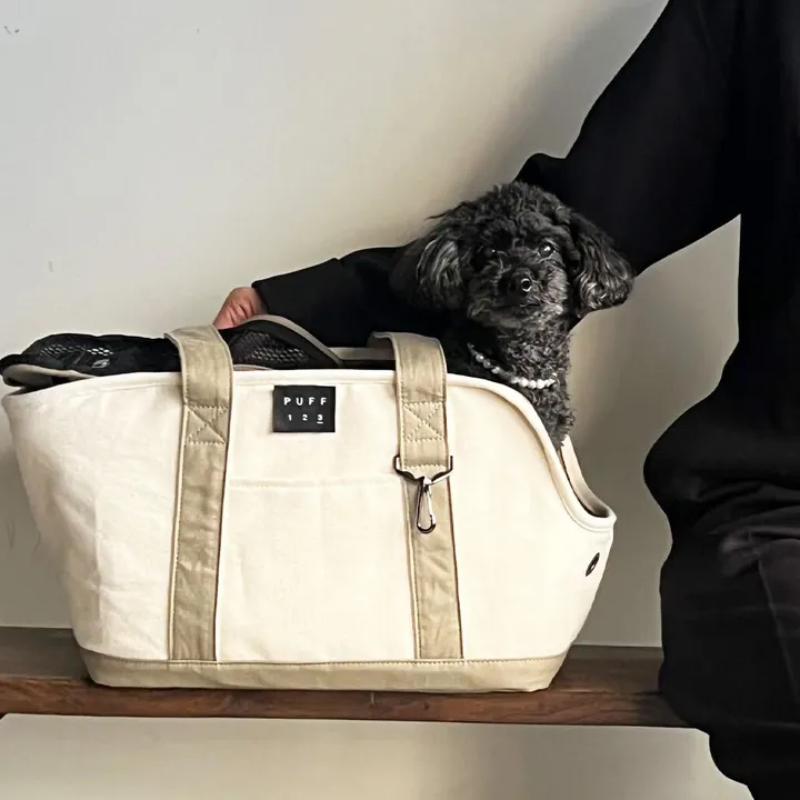●フラップ2重構造 本製品はフラップが2重になっています。 1枚目はコットン素材のフラップ。 完全に外が見えない状態になります。 2枚目はメッシュ素材のフラップ。 メッシュを閉じると飛び出す危険性は少ないので 交通機関を利用する方にもお勧めいたします。 ●フラップ収納 1枚目のフラップはくるくると巻いてポケットにそのまま入れて下さい。 2枚目のメッシュフラップはくるくると巻いて 内側から出ているテープで外側のスナップで留める事ができます。 ●フロントポケット オープンポケットなのでさっと取り出せるおやつなどを収納するのに便利です。 ●背面ポケット 上下が貫通した帯状のジッパーポケットがついています。 スーツケースの装着可能。 車に乗せる時はシートベルトで安全に固定する事もできます。 さらにジッパーポケットになっているので大事な小物や、 カワイイ瞬間を逃さないようにスマホを収納しても◎ ●サイドの空気穴 高さが低い方向(顔が向いている方向)に大きめの空気穴を付けています。 ●底板  バッグの形が曲がらず、底の形を保ちます。 底板はしっかりとした補強剤が入っており、 ペットの足腰を守りたるみの心配がなく安定感を持って使用できます。 ●底板カバー(ふわふわ素材) 板サイズよりも長めにお作りしております。 底の設置する時に長い部分をくるくるとして クッションのようにもでき、必要の無い場合は底に折り込むとフラットになります。 トートからお顔や腕を出すとリラックスする子が多いようです。 その場合にはカバーを伸ばしてご使用すると ジッパーや鞄の端が当たる事がなく快適に過ごす事ができます。 ●ハンドル(持ち手) ハンドルクッションにより肩への負担を軽減。 肩掛けができるように長めの仕様になっています。 ●内装の安全リード ペットにとってのシートベルトです。 安全リードを首輪やハーネスにつなげてご利用ください。 ●ハンドルのナスカン金具 お手持ちのポーチなどをひっかけるのに最適です。 こちらはナスカンになっていますので ヒキテやループなどがあるポーチなら簡単に装着する事ができます。 【PUFF 販売価格について】 弊社設定上代(税込価格)での販売のご協力をお願いいたします。 また、商品に対してのクーポン等はご遠慮いただいております。 ショップ全体でのクーポン等は問題ございません。 ご理解・ご了承のほどお願い致します。