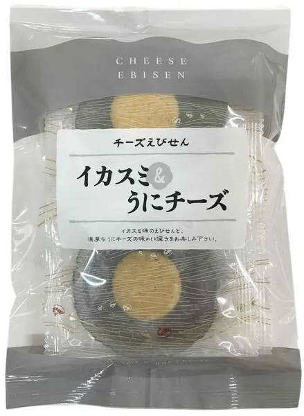 イカスミ味のえびせんべいに、うに味のチーズクリームをトッピングしました。 礒の香り豊かなえびせんべいです。 若い女性に特に人気が高く、「新しい美味しさ」と評判です。