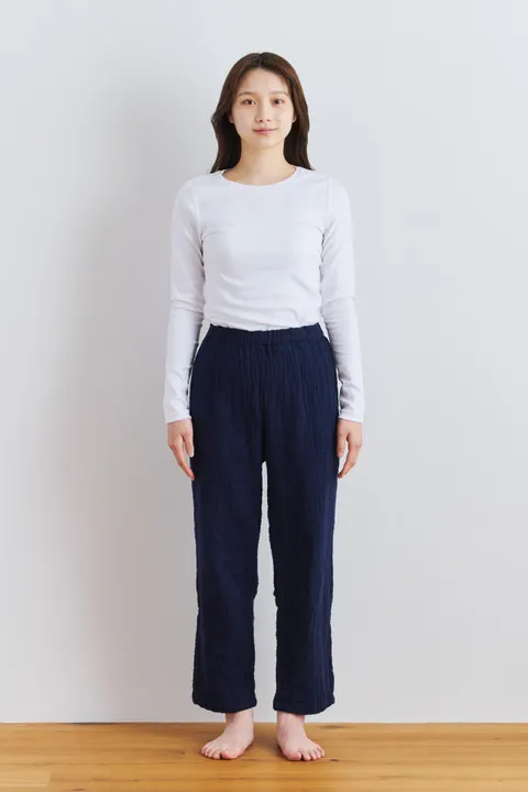 3重ガーゼでできたルームパンツです。 パジャマ、部屋着、お風呂上がり、台所で、さまざまにお使いいただけるルームウェアとして、また、363°でおかげさまで人気のワンピース同様、ちょっとそこまでお出かけくらいならできるワンマイルウェアとして、ご要望の多かったパンツが完成しました。 夏は涼しい通気性、秋冬もあったかアイテムとしてお使いいただけます。 部屋干しでも乾きやすいので、それほどたくさんの洗い替えも必要ありません。 いつもどおりのお洗濯方法で遠慮なく洗えます。 シワも気になりづらい生地なので、ぜひ気兼ねなくいろんなシーンでお使いください。 サイズはS、M、L、XLがあります。身長やお好みの丈感に合わせてお選びください。 ウエストはゴムになっています。お召しになる体型はそれほど問いません。 ルームパンツにXLが新登場しました! XLはS~Lに比べ、ややワイドストレートで股上を深めにとっており、男性の方にもお召になっていただきやすいシルエットです。 ※XLサイズのみ、既存のS・M・Lとシルエットが異なりますので、お買い上げの際はよくご確認いただけますと幸いです。