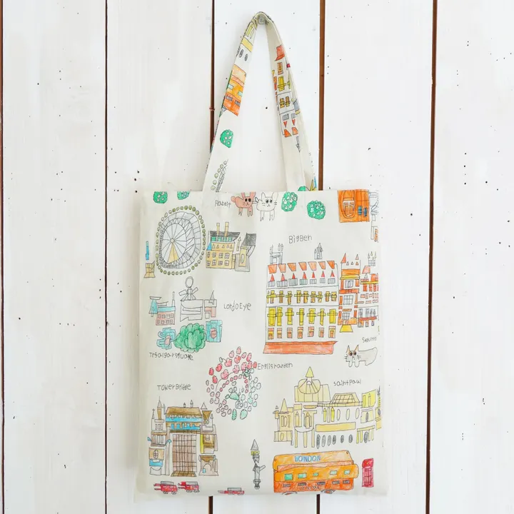 松永 紬/ロンドンのアートワークを使用した、 ざっくりとした風合いのコットンリネンバッグです。 A3サイズのファイルがぴったり入る大きさ。 使用しない時は、コンパクトに折り畳んでしまえるのでサブバッグにぴったりです。 こちらの商品は裏表別柄になります。 松永 紬 通称つーちゃん。マメで根気のある性格で、好きになったらそのことで頭がいっぱい。 今はプリキュアと担当職員に夢中で、毎日手紙を書き、 みかんを毎日持ってきたり、春は毎日お花を摘んでプレゼントしたり。 彼女にしか見えてない世界があるようで、いつも皆を楽しませてくれる。 モチーフをよく見ながら得意の建物の絵や、かなり長い英文も丁寧に黙々と描いていく。 ●サイズ:W34㎝×H42cm 持ち手:26㎝ (商品によって若干の差異がございます。) ●マチなし、内ポケットなし ●素材:リネン55% + コットン45% ●裏表別柄 ・布の特性上、生地のごくわずかな凸部分に染料が十分吸収されず、  小さな白いスポットが生じる可能性があります。 ・生地の特性上、生地の表面に細かな糸くずなどの異物(ネップ)が混入することがあります。  リネン55% + コットン45% ・洗濯の際は色移りすることがありますので、  たっぷりの水で単独洗い・ すすぎを行ってください。 ・色移り(色落ち)を防ぐためには、洗濯後すぐに洗濯機で十分に脱水をする必要があります。  (手絞り不可)   (万一、色移りした場合は、熱いお湯で洗いなおすと染料が落ちる場合がございます。) ・お使いのデバイスにより商品写真のお色が実際と異なることがあります。ご了承ください。