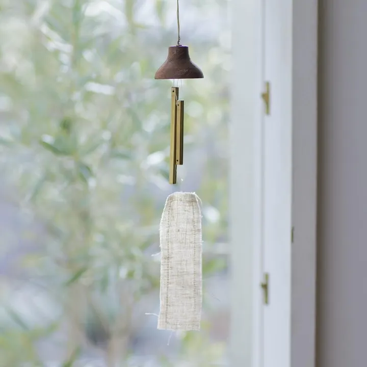 真鍮のパイプと木の帽子を組み合わせた、愛らしいフォルムの風鈴。 自然素材の質感を活かしたリネンの風受けが風をやさしく捉え、真鍮ならではの澄んだ音色が穏やかに響きます。 玄関や窓辺、室内に飾って、日常に静かな癒しを添えてくれる一品です。 日本では風鈴が魔除けの効果があるとされていることから縁起物としても人気があり、贈り物やインテリアとして多くの方々に愛されています。 お客様の中にはドアベルの代わりとして使用されている方も。 *デザインボックス入り