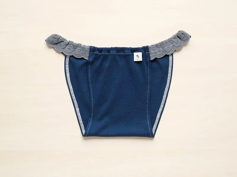 ※サンプルのため、パッケージに入れずにお渡しします。 しっとりとした紺色。 マアルの肌着へのこだわり「締め付けない・気持ちいい」に「大人っぽさ」を加えました。 素材はフェアトレードのオーガニックコットン100%。 綿の栽培から糸づくりまで、世界的なソーシャルプロジェクト=bioRe project に担われており、 気持ちがいい!と感じた肌着がどこまで遡ってもマアルく気持ちのいいフェアトレードの関係で生まれたものであるようにと願っています。 無農薬有機栽培で育てた綿を国内で丁寧に編み、国内の染工場で生地を反応染料で染めました。 伸縮性があり、とても柔らか。 縫い糸もオーガニックコットン100%。 一般的な下着は伸縮性があり、廉価な化学繊維の糸で縫いますが、 肌が繊細な人は化繊糸に痒みを感じる人が多いため、独自の方法で1着1着、オーガニックコットン糸で縫っています。 オリジナルのエンブロイダリーレースも、栃木県の工場で特別にオーガニックコットン糸だけで作っています。 そのレースを広島県尾道市の向島で天然草木染め工房を開いていらっしゃる「立花テキスタイル研究所」さんで、 近隣の家具屋さんから出た胡桃の木の廃材でレースをグレーに染めていただきました。 草木染めなので、染める日の気温や材のちょっとした変化で色味に濃淡の差が出ております。 あらかじめご了承ください。 marruのショーツは股上がかなり浅めです。 これは、ゴム部を骨盤輪の上に乗せることで、腸を締め付けないようにするためです。 だから、お腹の大きな妊婦さんでも履き続けることができます。 一見冷えそうに見えますが、 足の付け根(鼠蹊部)やお腹周りを締め付けないことで、 体温の上昇作用も大学との共同調査で明らかになりました。 品質表示ラベルは、あえて外側に。 取り外しやすいよう、大きめのミシン目で本体の縫い目とは別に取り付けてあります。 これも、肌刺激を減らす工夫です。 また、ゴム交換口を用意してあります(左前のマアルタグの内側あたり)。 お好みの緩め具合に調整したり、太った、痩せた、妊娠したなどといった体の変化にも対応できます。 サイズ:S(W58~64cm H82~90cm)     M(W64~70cm H87~95cm)     L(W69~77cm H92~100cm)     LL(W77~85cm H102~110cm)     (W:ウエスト H:ヒップ)