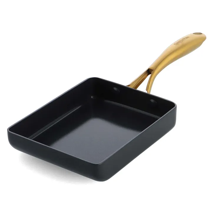 ノンスティック・セラミックコーティングが施され、熱伝導に優れたこびりつきにくいエッグパンです。ハンドルが中空になっているので軽く調理やお手入れをしやすい点も嬉しいポイント。ブラックのボディとゴールドのハンドルの上品なデザインは調理後そのまま食卓にサービングするのもおすすめです。