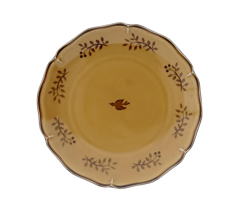 "フランスの蚤の市で見つけたお気に入り" をテーマに、どこかノスタルジックな雰囲気を感じられるような食器とファブリックのご提案です。 エテルニテとはフランス語で「永遠」という意味。 永遠の幸せを願って、リース柄と野花のパターン柄を描きました。 色味が同じ柄違いの器を一緒に使うと、統一感がありつつ食卓に動きが出て、テーブルコーディネートがワンラックUPします。 全部テーブルに並べてもうるさい感じがなく、新生活を始められるブライダルギフトにもおすすめのシリーズです。 リースとトリ柄のシンプルなプレートLは、5号サイズのホールケーキをのせて使うのにぴったりです。 リムが立っているのでソースたっぷりの煮込みハンバーグなどにも使えます。