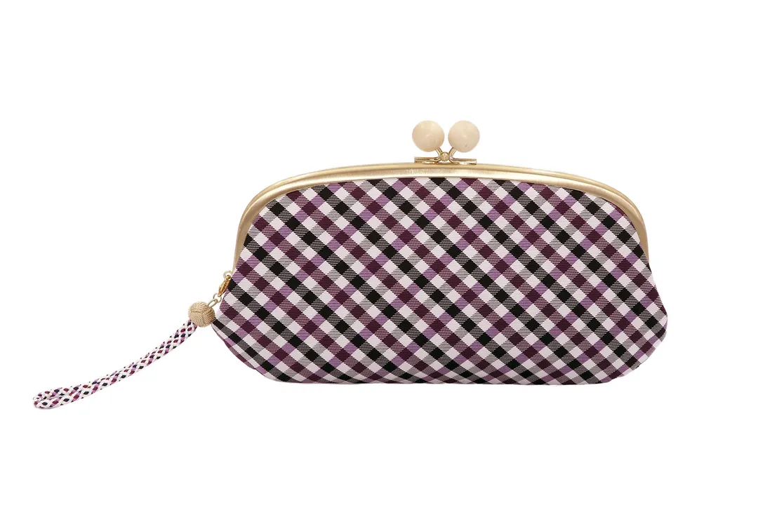 毎日使える伝統工芸財布/西陣織シルク・がま口長財布・親子がま口・京組紐ストラップ付・ギンガムチェック・レディース・日本製 パープル系
