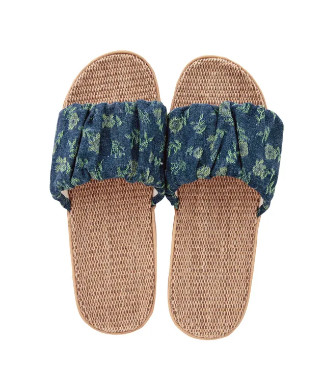 人気のジュートソールに個性的なデニム生地を合わせました。 花柄の生地はゴブラン織りのような質感で、地色はブラック系とブルー系の2色。 一方で甲部分がクロスデザインになっているほうは、ダメージ加工を施した箇所に細かいラメを散りばめたかなり珍しい生地を使用しています。こちらもインディゴブルーとライトブルーの2色展開。 “カッコいい”と“かわいい”が同居する、大人向けカジュアルスリッパはいかがでしょうか? 軽量タイプなので、暑い夏でもライトな履き心地で過ごせます。