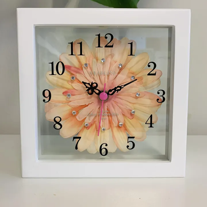 3枚のクリアなガラスにピーチ色のガーベラの造花を挟んだ、かわいくておしゃれな置き掛け兼用時計です。 後ろのフックを壁に固定したら、壁掛け時計としてもお使いいただけます。 美しく鮮やかなガーベラの造花は、爽やかさと同時に豪華な空間を演出します。 どんなインテリアにも調和し、日常を彩るアートピース。時間の経過を優雅に告げるこの時計は、目にするたびに笑顔を運びます。 リビング、寝室などはもちろん子供部屋でも可愛い! またガーベラには「希望」「前向き」「常に前進」という花言葉があります。 ピーチ色のガーベラの花言葉には「思いやり・崇高な愛・愛情」という意味があります。 コンパクトなサイズで、母の日、誕生日、開店祝い、記念日など様々なシーンのプレゼントにも最適です。 ぜひこの機会にご利用くださいませ。