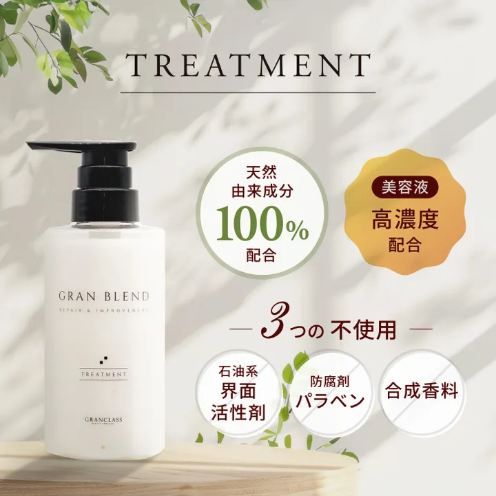 美髪クリニック開発の『上質素材のみを使用した高濃度美容液トリートメント』 グランブレンドトリートメントは、髪1本1本の内部に栄養成分をしっかりと浸透させ、ツヤ・ハリ・コシを生み出す新感覚トリートメントです。 また栄養を与え、より美髪を維持して頂けるよう、責任を持って独自開発し製品化に至りました。 「GRAN BLEND」は髪と頭皮に優しいものだけにこだわり、 下記成分を使用しておりません。 ・パラベン不使用 人体に対する毒性が低いとされる防腐剤「パラベン」さえも不使用。 ・石油系界面活性剤不使用 髪や頭皮の健康のため、洗浄力の強い「石油系界面活性剤」は不使用。 ・合成香料不使用 人工的に精製・製造された「合成香料」を使わず、天然アロマの香りを配合。