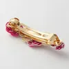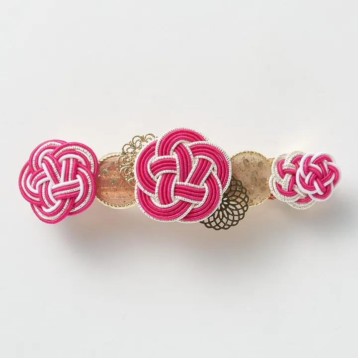 ゴールドの台座に大小4つの梅結び水引がついた華やかなバレッタ。一番人気の商品です。 一番大きな梅結びには水引きを5本使用し、組み合わせや重ねる順番を少しずつ変えているのでひとつずつ表情が異なっているのがポイントです。 海外の方にはピンク、ブルー、ネイビーなどはっきりしたカラーが人気です。 日本の方は、結婚式や学校行事用に購入される方が多くフォーマルなシーンにもおすすめです。