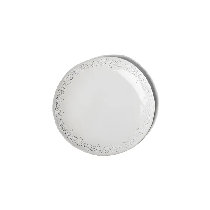 乳白の釉薬にグレーが透けた、ニュアンスのあるホワイトがよりいっそう際立つシンプルな一皿。 朝食のプレートや取り皿としても重宝しそうなサイズ感です。レースのような植物模様のレリーフが華やか。 レリーフシリーズはアイテムごとに彫り込んである図案が異なり、少し深さがあり、毎日使いやすい機能的なフォルムになっています。 「レリーフ」と「ライン」の形状は、プレートのS,M,L,LLサイズ、ボウルのS,Mサイズが同じサイズですので、合わせて揃えるだけでなくお好きなタイプを混ぜても使える、遊び心のあるラインナップです。 Mulet(ミュレット) スウェーデン語で「くもり空」という意味を持つ「Mulet」は、その名前の通り、白と灰色のニュアンスのある色合いが印象的なシリーズです。 色合いだけ見ると、ともすれば冷たい印象を受けそうですが、Muletにはあたたかな雰囲気が宿っています。それは、あえて1点1点少しずつ異なる形に仕上げた歪みのある形、釉薬の濃淡などから、手仕事の跡やぬくもりが伝わってくるから。決して派手さはありませんが、お料理をそっと静かに引き立て、例えば異素材である木や金属、ガラスなどの器やカトラリーなどにもしっくりと馴染みます。 Muletシリーズは土からオリジナルで開発するこだわりをもって作られています(一般的には製土屋さんから土を購入し、そのまま使用されるつくり手さんが多いのです)。コバルトや鉄分を多く含んだ土に、日本で古くから使われてきた信楽焼のさっくりとした荒い土をブレンドした黒土に磁器の成分を20パーセントほど足し生地の強度を上げ、オリジナルの乳白の釉薬を掛け、何度も試作を重ねてようやくこの独特の色合いが完成しました。 そして、このシリーズを作るために岐阜県に構えた自社工房にて、攪拌機で練り上げ、1250度で焼き上げます。高い温度で焼き締めているので、薄くて丈夫な仕上がり。電子レンジや食器洗い機を使うこともでき、とても実用的です。 Muletには「レリーフ」「ライン」「ハンド」の3種類のラインナップがあります。 植物模様が華やかなレリーフ、どんなお料理にも合うシンプルな縁のライン、そしてデザイナー自身がロクロで手引きした原型に忠実な形状と、シーンやお好みで楽しんでお選びいただけます。