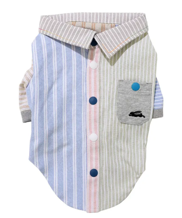 スナップボタンと袖リブ、チェックとストライプが特徴のハッピーシャツが今年も登場! 今年は清涼感をテーマに春らしい色合いで仕上げた6色展開。 襟にレインボーステッチを使用したデザインがさり気ないポイントです。 他にないドッグウェアで他のわんちゃんと差別化しちゃおう!