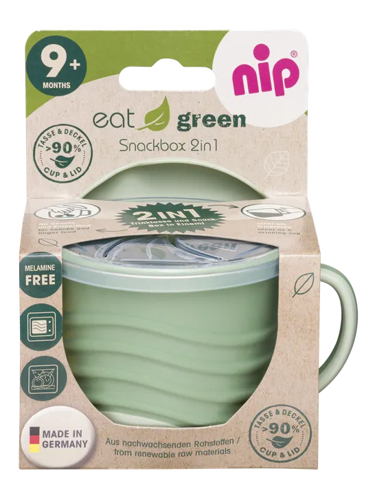 ドイツの赤ちゃん用品をドイツ国内で製造を続けている家族経営の老舗ブランド、nipの製造する環境に優しいeat greenシリーズ。 有害物質を一切排除したから、熱いものを入れても有害物質が溶け出す心配がありません。安心して電子レンジも使える、そして耐久性もあり兄弟姉妹で長く使っていただける食器です。 ●スナックボックスそして、コップとしてもご使用いただける2Way ●柔らかく取り出しやすいのに、お菓子がこぼれないシリコン製蓋で赤ちゃんの指先や手を使う練習に ●取手がつき、握る練習に ●蓋がつき、持ち運びにも便利 ●落としても壊れない素材 ●BPA(ビスフェノールA)、PVC(ポリ塩化ビニル)、メラミン、コーティング不使用 ●90%以上が再生可能な原材料(炭水化物と植物油)を使用、100%リサイクルパッケージ ●食洗機対応 ●電子レンジ対応 (シリコン製中蓋、外蓋以外) ●9ヶ月からの幼児推奨 ●ドイツ製