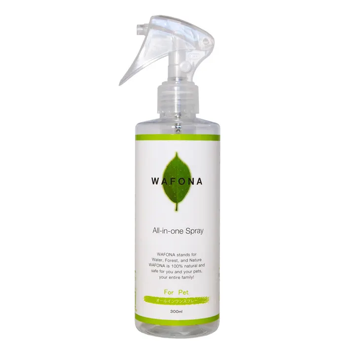 『1本で全身のお手入れからおそうじまで』 WAFONAオールインワンスプレーは愛犬が「舐めること」「毎日使うこと」を前提に、化学合成物質を一切使用せず、108種類の植物エキスと、不純物を取り除き、クラスターを極小化した純水のみを配合して作られています。 植物由来の天然成分が気になるニオイをすっきりさせ、浸透性の高い水が皮膚・被毛を保湿し、愛犬の健康維持をサポートします。 1本で全身のケアから、おそうじまでお使いいただけるオールインワンスプレーです。 また、涙やけ等のお手入れ等に便利な『オールインワンスプレー コットン専用ボトル』もご用意。 用途にあわせて、ボトルのタイプをお選びいただけます。 また、詰替え用もご用意しております。 ※300mlで900回のプッシュ可能(使用状況により変わります) 〈成分〉 108種天然植物エキス・落葉ブナ葉エキス・デキストリン・ポリフェノール・カテキン・アミノ酸・各種ビタミン・各種植物吸収ミネラル 〈製品特徴〉 飲用水適合検査に適合しています。(第53-18-04433号) 植物(フィトンチッド)の力で愛犬の健康維持のサポートをします。 化学合成物質は一切使用していません。 〈使用方法〉 愛犬の体にスプレーした後、マッサージするようによく揉み込んで、浸透させてください。 その後タオル等で拭き取り、ブラッシングをして仕上げてください。 耳元・目元・口周りはコットンやティシュ等にスプレーを含ませ、優しく揉むように拭いてください。 トイレ周り、ケージの中、粗相の後、車の中の生活空間にもお使いいただけます。 〈使用上の注意〉 ペットの体質に合わない場合は使用を中止してください。 開封後はできるだけ早くお使いください。 直射日光に当たらない涼しい場所で保管してください。 ※お願い※ 当店では、新規のお取引におきまして、現在ECモールでの販売の方はお断りをさせていただいております。 ご理解、ご了承の上、ご発注お願い申し上げます。
