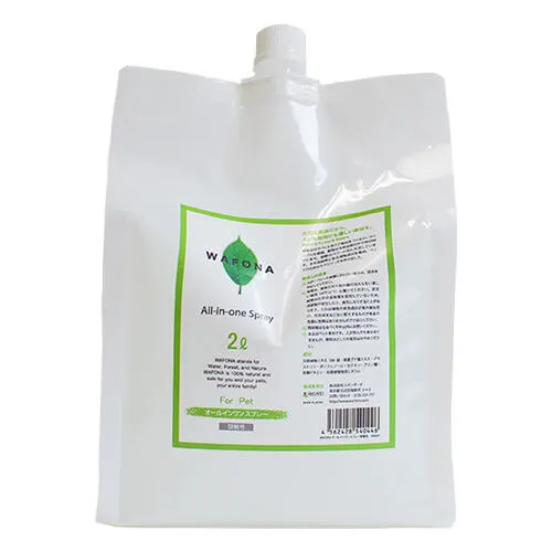 『1本で全身のお手入れからおそうじまで』 WAFONAオールインワンスプレーは愛犬が「舐めること」「毎日使うこと」を前提に、化学合成物質を一切使用せず、108種類の植物エキスと、不純物を取り除き、クラスターを極小化した純水のみを配合して作られています。 植物由来の天然成分が気になるニオイをすっきりさせ、浸透性の高い水が皮膚・被毛を保湿し、愛犬の健康維持をサポートします。 1本で全身のケアから、おそうじまでお使いいただけるオールインワンスプレーです。 また、涙やけ等のお手入れ等に便利な『オールインワンスプレー コットン専用ボトル』もご用意。 用途にあわせて、ボトルのタイプをお選びいただけます。 また、詰替え用もご用意しております。 ※300mlで900回のプッシュ可能(使用状況により変わります) 〈成分〉 108種天然植物エキス・落葉ブナ葉エキス・デキストリン・ポリフェノール・カテキン・アミノ酸・各種ビタミン・各種植物吸収ミネラル 〈製品特徴〉 飲用水適合検査に適合しています。(第53-18-04433号) 植物(フィトンチッド)の力で愛犬の健康維持のサポートをします。 化学合成物質は一切使用していません。 〈使用方法〉 愛犬の体にスプレーした後、マッサージするようによく揉み込んで、浸透させてください。 その後タオル等で拭き取り、ブラッシングをして仕上げてください。 耳元・目元・口周りはコットンやティシュ等にスプレーを含ませ、優しく揉むように拭いてください。 トイレ周り、ケージの中、粗相の後、車の中の生活空間にもお使いいただけます。 〈使用上の注意〉 ペットの体質に合わない場合は使用を中止してください。 開封後はできるだけ早くお使いください。 直射日光に当たらない涼しい場所で保管してください。 ※お願い※ 当店では、新規のお取引におきまして、現在ECモールでの販売の方はお断りをさせていただいております。 ご理解、ご了承の上、ご発注お願い申し上げます。