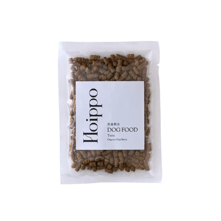 Hoippoのドッグフードシリーズ、本製品は肉類を一切含みません。 主原料には国内の漁港で採れる旬の魚を使用し、フードの50%以上主含み食べ応え抜群。一尾骨や皮も丸ごと含みます。 本製品に使用した「ゴジベリー(クコの実)」は、免疫力だけでなく目に良い成分が多いスーパーフード。有機認証を取得した原料を採用しています。 また低温製法仕様は、通常120度ほどで焼き上げる製法に比べ、60度から80度の温度でゆっくり焼き上げるため栄養素が残りやすく、風味のあるフードに。独自の製法を用いることにより、強化剤を含まず総合栄養食の基準を満たした仕上がりになっています。 手作りご飯のお供に、カリカリが苦手なわんちゃんにもおすすめです。 外出先でも持参いただけるお試しサイズの50g、通常サイズは500g、1kgの3種類をご用意。 ぬるま湯をかければウェット仕様に。幼犬から老犬まで安心して食べていただけます。 商品のポイント 1. 低温製法で自然風味や栄養素が残りやすい 2.主原料に国産マグロを骨や皮丸ごと使用 3. 総合栄養食 4. 肉類不使用(お肉が食べられない愛犬にもおすすめです) 5. 国内工場で製造 一日の標準給与量目安(成犬) 超小型犬 1kg~5kg・30g~103g 小型犬  5kg~10kg・103g ~172g 中型犬  10kg~20kg・172g~289g 成分保証分析値 347kcal(100g) 粗たんぱく質27%以上、粗脂肪9%以上、粗繊維3%以下、粗灰分7%以下、水分10%以下