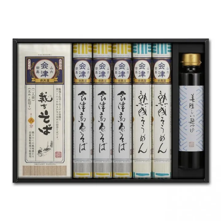 裁ちそば200g×3束 会津高原そば200g×3束 熟成そうめん200g×2束 めんつゆ180ml 包装・のし掛けも可能です。 別途紙袋をおつけいたします。