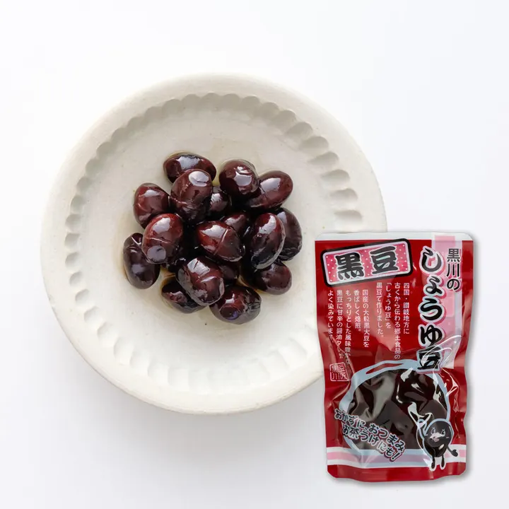 しょうゆ豆とは香川県に古くから伝わる郷土料理です。 乾燥保存した豆を弱火でじっくりと焙煎し、砂糖・醤油・唐辛子などで作るタレに漬け込んで作ります。 そら豆で作られることが一般的ですが、黒豆を使って作られることもあります。 通常、手間暇をかけて作られるしょうゆ豆を手軽に食べられるよう開発されたのが本品です。 黒豆で作るしょうゆ豆は皮が薄くて食べやすく、少しもっちりとした食感に仕上がります。 煮豆と違って少し歯ごたえがあるので、初めて食べるときには驚かれるかもしれません。 しかしこの独特の食感と甘辛い醤油の風味で多くの方に長年愛される一品です。 黒川のしょうゆ豆は、調理を機械化し手間を少なく安価に流通できるようにする一方で、家庭料理のぬくもりを感じられるよう昔ながらの製法を大切に製造しています。 使用する原材料は「黒豆・三温糖・醤油・唐辛子」のみ。添加物は使用しません。 黒豆は国産の大粒だけを使用しています。 保存料なしでも賞味期限は製造から半年。その長期保存を可能にしているのが真空パックと加熱・加圧殺菌の工程です。 加熱調理済みですので開封してすぐにお召し上がりいただけます。 常温で長期保存が可能なので、戸棚に常備して忙しい日の食卓にさっと一品追加…といった使い方をされているお客様も多くいらっしゃいます。