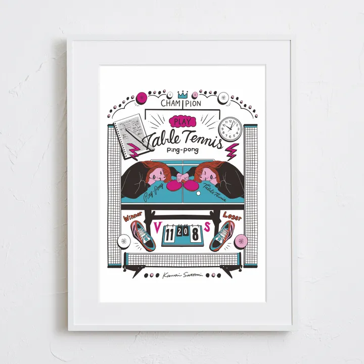 アーティスト -PROFILE- Satomi Kawai(サトミ カワイ) イラストレーター&グラフィックデザイナー 女子美術大学デザイン学科卒業 デザイン会社での勤務経て2015年フリーランスに。 ちょっとシュールで小洒落たイラストを描いています。 【作品について】 卓球はマイナーなスポーツ!? いえいえ、かっこいいおしゃれなスポーツなんです。 そんなかっこよさをアートとして表現した作品。 作品名:table tennis 手法:イラスト、デジタル ペーパー:高品質半光沢紙 マットカラー:白 マット*:DXホワイト芯 100%バージンパルプ/PH7・中性紙(2mm厚) ※全てのアートにマットがつきます フレームカラー:黒、白、無垢(3種類から選択) ※マット付のため通常とはフレームサイズが異なる規格となります。 【マット*とは?】 アートポスターの周りに挟んだ厚紙の事。 マットを使わない時に比べ余白により広がりが生まれ、作品の新たな一面を引き出せ作品の見栄えがグッと良くなります。また、額縁のガラス面と作品が直接触れたままにしておくと、くっついて作品を傷つけることがあります。マットを使用することでガラスと作品の間に空間ができ、作品を保護することができます。ブランドコンセプトにより全てのアートにマットがつきます。 ー ファッションのようにアートを ー 私達が掲げるコンセプトです! 毎日着替えるファッションの様に、アートも気軽に飾り変えて欲しい... 一旦飾り終えたアートにも光を当ててほしい... ポスター単体、またはリピートで中身だけのポスターを購入された方に"専用のハンガー"をセットでお届け。 「今までに無い!新しいアートの飾り方を提案」 飾る事がなくなった前のアートをハンガーにかけて洋服と一緒にかけてもらう。 その日の気分や、モチベーションですぐに取り換えられる様に。 もちろん、魅せる収納としても今までにないおすすめの飾り方です。