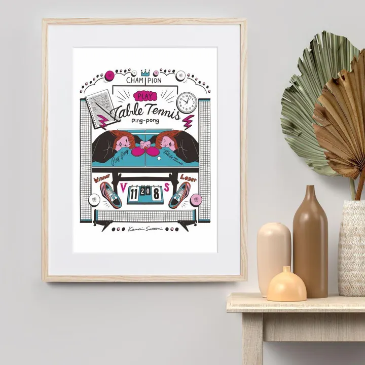 アーティスト -PROFILE- Satomi Kawai(サトミ カワイ) イラストレーター&グラフィックデザイナー 女子美術大学デザイン学科卒業 デザイン会社での勤務経て2015年フリーランスに。 ちょっとシュールで小洒落たイラストを描いています。 【作品について】 卓球はマイナーなスポーツ!? いえいえ、かっこいいおしゃれなスポーツなんです。 そんなかっこよさをアートとして表現した作品。 作品名:table tennis 手法:イラスト、デジタル ペーパー:高品質半光沢紙 マットカラー:白 マット*:DXホワイト芯 100%バージンパルプ/PH7・中性紙(2mm厚) ※全てのアートにマットがつきます フレームカラー:黒、白、無垢(3種類から選択) ※マット付のため通常とはフレームサイズが異なる規格となります。 【マット*とは?】 アートポスターの周りに挟んだ厚紙の事。 マットを使わない時に比べ余白により広がりが生まれ、作品の新たな一面を引き出せ作品の見栄えがグッと良くなります。また、額縁のガラス面と作品が直接触れたままにしておくと、くっついて作品を傷つけることがあります。マットを使用することでガラスと作品の間に空間ができ、作品を保護することができます。ブランドコンセプトにより全てのアートにマットがつきます。 ー ファッションのようにアートを ー 私達が掲げるコンセプトです! 毎日着替えるファッションの様に、アートも気軽に飾り変えて欲しい... 一旦飾り終えたアートにも光を当ててほしい... ポスター単体、またはリピートで中身だけのポスターを購入された方に"専用のハンガー"をセットでお届け。 「今までに無い!新しいアートの飾り方を提案」 飾る事がなくなった前のアートをハンガーにかけて洋服と一緒にかけてもらう。 その日の気分や、モチベーションですぐに取り換えられる様に。 もちろん、魅せる収納としても今までにないおすすめの飾り方です。