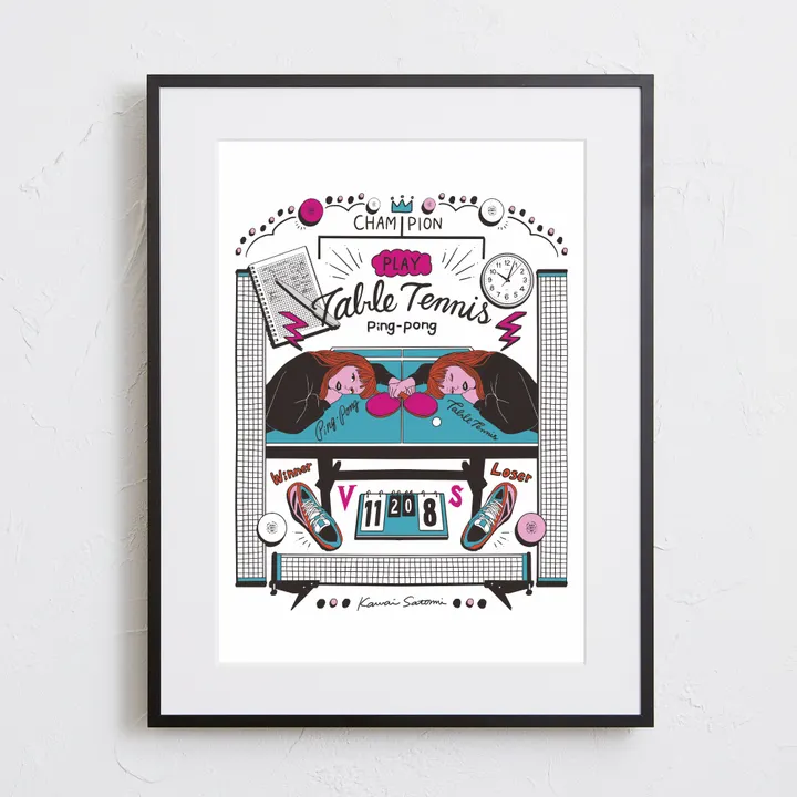 アーティスト -PROFILE- Satomi Kawai(サトミ カワイ) イラストレーター&グラフィックデザイナー 女子美術大学デザイン学科卒業 デザイン会社での勤務経て2015年フリーランスに。 ちょっとシュールで小洒落たイラストを描いています。 【作品について】 卓球はマイナーなスポーツ!? いえいえ、かっこいいおしゃれなスポーツなんです。 そんなかっこよさをアートとして表現した作品。 作品名:table tennis 手法:イラスト、デジタル ペーパー:高品質半光沢紙 マットカラー:白 マット*:DXホワイト芯 100%バージンパルプ/PH7・中性紙(2mm厚) ※全てのアートにマットがつきます フレームカラー:黒、白、無垢(3種類から選択) ※マット付のため通常とはフレームサイズが異なる規格となります。 【マット*とは?】 アートポスターの周りに挟んだ厚紙の事。 マットを使わない時に比べ余白により広がりが生まれ、作品の新たな一面を引き出せ作品の見栄えがグッと良くなります。また、額縁のガラス面と作品が直接触れたままにしておくと、くっついて作品を傷つけることがあります。マットを使用することでガラスと作品の間に空間ができ、作品を保護することができます。ブランドコンセプトにより全てのアートにマットがつきます。 ー ファッションのようにアートを ー 私達が掲げるコンセプトです! 毎日着替えるファッションの様に、アートも気軽に飾り変えて欲しい... 一旦飾り終えたアートにも光を当ててほしい... ポスター単体、またはリピートで中身だけのポスターを購入された方に"専用のハンガー"をセットでお届け。 「今までに無い!新しいアートの飾り方を提案」 飾る事がなくなった前のアートをハンガーにかけて洋服と一緒にかけてもらう。 その日の気分や、モチベーションですぐに取り換えられる様に。 もちろん、魅せる収納としても今までにないおすすめの飾り方です。