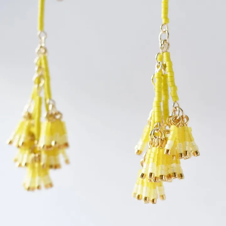 万葉の歌人 山上憶良が詠んだ 秋の七草のひとつとして知られるオミナエシ 秋空に向かってまっすぐに伸ばした茎の先に 上向きに咲いた たくさんの小さな黄色い花が夕日に照らされて 黄金色に輝きを増します material K14GF ゴールドフィルド(ピアス金具)、SILVER925 金メッキ(イヤリング金具)、ガラスビーズ、真鍮、チタン、シリコン *ゴールドビーズは本金メッキ加工を施したものを使用しております *取り付ける金具によって、使用している金属が異なります size 約20x70mm weight 約4.1-5.2g *取り付ける金具によって、重さが異なります *CACICOの商品は全て1点1点制作しているため、個体差があり、商品写真と差がある場合がございます。ご了承の上、ご購入ください。 *金属アレルギーの方はご使用をお控えください *受注生産のため、ご注文確定後1週間〜10日以内に商品を発送いたします