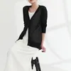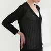 ・スリムな縦リブとヒップ丈のストレートフィット ・Vネックラインとボタン開閉仕様 ・カラーごとのラメ糸が含まれた上品な光沢感 ・夏まで快適に着られるシースルー素材