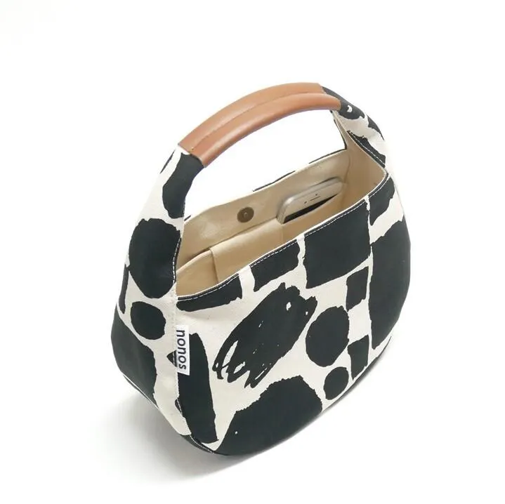 モノトーンの手描き柄はどこか懐かしく暖かみを感じます。そのオリジナル手描き柄プリントの帆布で作られたミニバッグ。バッグの丸いデザインと優しい手描き柄が重なり合い「カジュアルかわいい」バッグが出来ました。ちょっとしたお出掛けに、サブバッグに、気分が上がるミニバッグです。 外側はプリント帆布、内側は無地帆布、外内二重の帆布使いでしっかり自立出来るタイプです。持ち手部分には革を巻き上質感とおしゃれ感をトッピング、汚れ防止効果にもなっています。バッグの口元はマグネット釦付きで閉じる事が出来ます。内側にはマジックテープ付きのポケットとパスケースや鍵を固定出来るDカンが付いています。 いつまでも使い続けて欲しい、変わっていく風合いを楽しんで欲しい、そんな思いから日本製に拘りました。 <サイズ> W : 24cm H : 19cm (持ち手部分は含まない) D : 10cm (底部分) 持ち手の長さ : 33cm 重さ : 約200g <仕様> 本体 : 帆布二重仕立て ハンドル : 革巻き 開閉口 : マグネットボタン 内側 : ポケット(マジックテープ付き)×1 Dカン×1 肩掛け : 不可 B5収納 : 不可 <素材> 表地 : 綿100% 富士金梅 8号帆布 プリント加工(千葉/松戸 FACTORY) 裏地 : 綿100% 富士金梅 8号帆布 持ち手 : 牛革 姫路 LEATHER <縫製> 日本製(東京/ATELIER) ※商品により柄の出方が違う場合があります。 ※濡れたものと強く擦ると希に色落ちする場合がありますのでご注意ください。 ※商品写真はできる限り実物の色に近づけるよう徹底しておりますが、 お使いのモニター設定、お部屋の照明等により実際の商品と色味が異なる場合がございます。