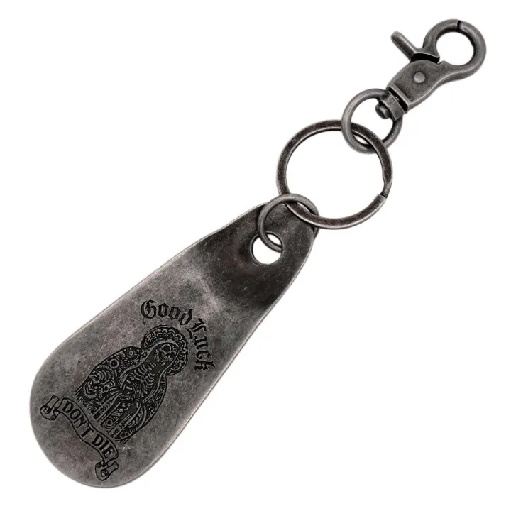 サンタ・ムエルテ(Santa Muerte、聖なる死の聖母) 彼女は「死から守ってくれる」存在として、死そのものではなく、生者の守護者と見なされます。特に社会的弱者にとって「公式の聖人が助けないときの最後の頼み」として機能します。 ヴィンテージなデザインとカラーのシューホーンで、普段はキーホルダーとして使用し、携行することでいつでもシューズの踵をつぶすことなくスマートに履くことができるアイテムです。