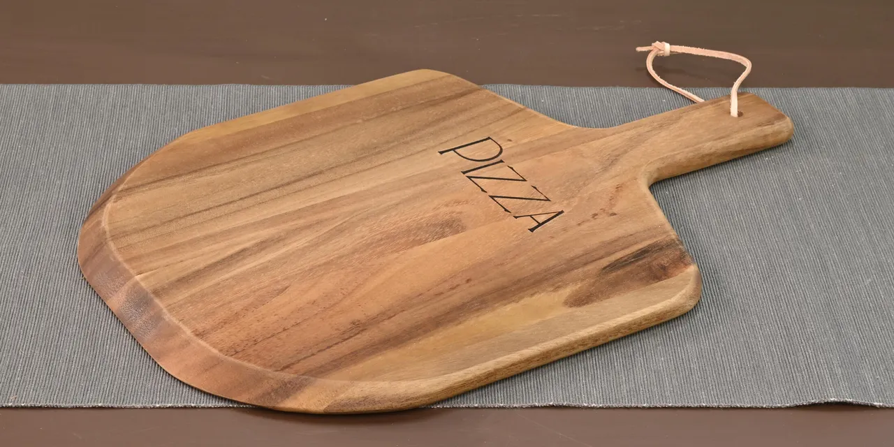 【概要】 熱々のピザを乗せ、テーブルにそのまま出すだけで、食卓をおしゃれに演出してくれるピザボード。 業務用としても活用できる厚さ15mmのアカシア材を使用しています。 【こだわり】 ≪スタイリッシュなデザイン≫ ピザをかまどに入れるときに使うピザピールをイメージしたデザインです。 大きな「PIZZA」という文字は存在感抜群。 チーズやパンなど、ピザ以外の食材を盛り付けても映えます。 ≪お皿とまな板の一人二役≫ ピザを乗せるお皿として使えるのはもちろん、 ピザをカットするまな板代わりにもご利用いただけます。 ≪持ち運びやすい取っ手付き≫ 取っ手がついているので持ち運びが簡単です。 紐穴に紐を通せばフックにかけておくことも。 ≪地球にやさしい植林材を使用≫ 東南アジアの計画植林で育てられた木材を使用。 植林から伐採までのサイクルが厳格に管理されているため、地球環境への負荷を最小限に抑えられます。 ≪熟練の職人によるハンドメイド≫ 一つひとつ職人が手作業で仕上げています。 手作りならではの風合いをお楽しみください。