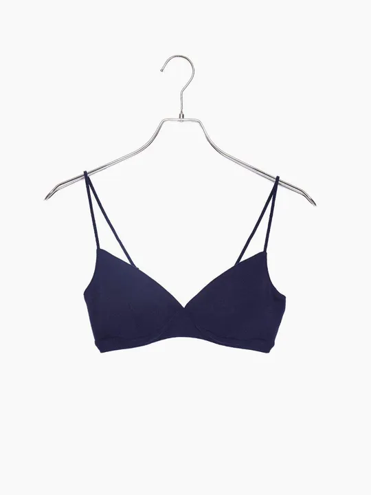 伸縮性に優れたオーガニックコットンのフライス生地を使用したブラトップ。 ストレスフリーな着用感ながら、アンダー部分にはストレッチテープをあしらって、アンダーバストから体のラインにそってずれにくいのが特徴。 バスト全体を包み込む安心感のある着心地のため、ソフトブラ初心者や、フィットネス時にスポーツブラとして着用することもできます。 SkinAware では「ボタニカルダイ(植物染め)」によってオーガニックコットンの特性を損なわず、様々な色を表現しています。 ボタニカルダイとは、 植物の花、葉、果実などから抽出した染料をタンパク質で生地に吸着させ、植物本来の持つ鮮やかな発色を実現した新しい染色技術。 自然とサイエンスを融合させたハイブリッドな染色方法は、植物が持つエネルギーを感じることができ、リラックスやヒーリング効果も期待されています。 カラーは、邪気を祓うお守りの木として知られるログウッドで染めた「ネイビー」。 ・バストパット取り外し可能 ・肩紐にアジャスター付き ショーツ WLS014B とセットアップが可能です。