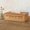北海道 旭川市の自社工場で製作しています 市販のボックスティッシュは色がカラフルなものが多く、 お部屋のインテリアでは浮いてしまいがちなもの。 どんなに派手な色の紙箱も、木製ケースに隠してしまえばOK。 さりげなく入ったゴシック体のロゴがカッコイイ。 上の板が蓋になっているのでティッシュの交換も簡単です ■商品サイズ 約 横幅265×奥行140×高さ80mm  (板の厚みなどで、多少の誤差が出る場合があります) ■材質 合板を使用 木目、色合いなどが1つ1つ違います。 高さ62mmまでのスリムボックスティッシュが入れられます。