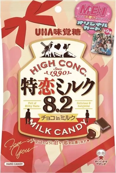 パッケージ表面の右上には、「ME:I」の可愛らしいロゴマークを記載しております。 京都芸術大学の学生から新たに募集した恋の応援メッセージを記載しております。メッセージ付き個包装は約30種類です。その内の5種類は小山薫堂さんによるメッセージです。 ME:Iのメンバー写真付きのオリジナルメッセージカードが全9種類封入しております。