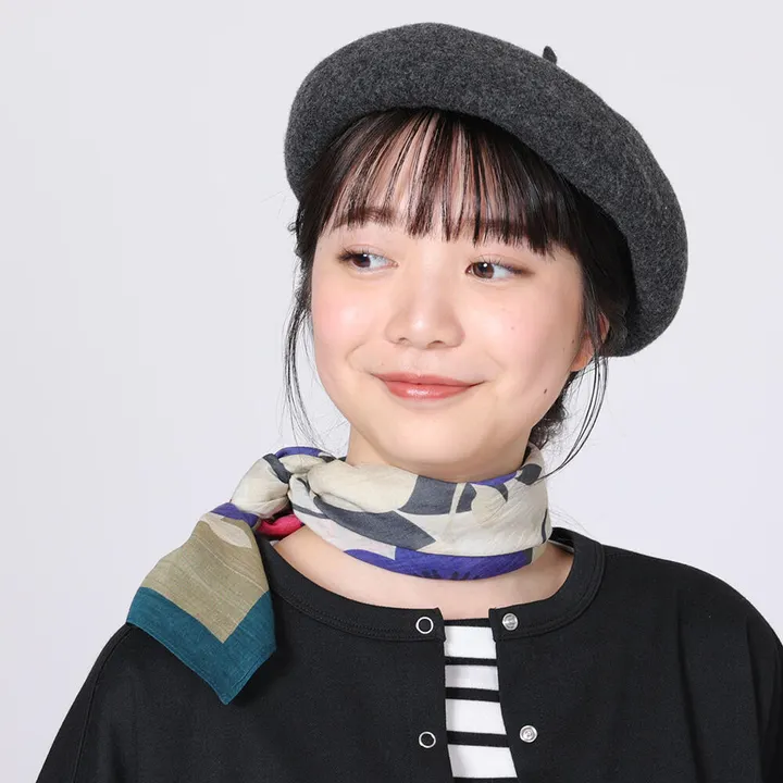 スカーフ┃ショートサイズで首元に巻きやすいコットンシルクのスカーフ(アネモネとパンジー) GN(グリーン)