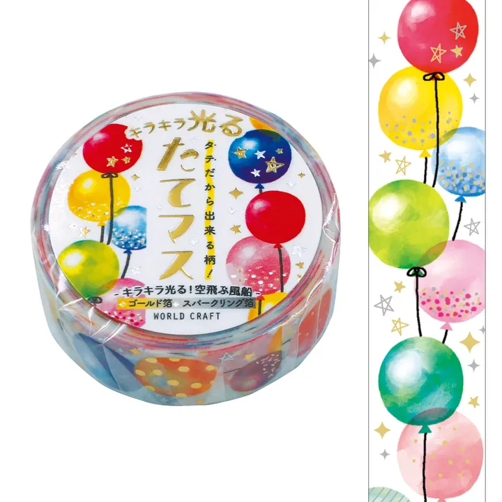 【キラキラ光るたてマス Balloons】 ◎キラキラ光る!空飛ぶ風船がかわいい♪  デコレーションに使いやすいバルーン柄。  カラフルにキラキラ光り、華やかに彩る柄です。 ◎誕生日のレターやパーティーグッズのデコレーションにも  おすすめのアイテムです◎ ★有名店のプロが厳選して最新文房具のNo.1を決定する『文房具屋さん大賞』の  【2022年度版・マスキングテープ部門】での『5位入賞商品!』※p80〜p81掲載  「キラキラ光るたてマス」  品番:TMKR15-001 〜 012(12柄)  ※紙面掲載価格は価格改定前の価格になります。 ---------------------------------------------------------------------------------------       ☆★☆★ キラキラ光るたてマス ☆★☆★ 「 たてマス 」の柄と仕様が異なるリッチバージョン! 絵柄の長さは広範囲の大ボリューム " 300mm " ! ゴールド × スパークリング の2種類の箔入りでデコレーションの満足感も◎ 『縦柄だから出来る、なが〜いモチーフ』 や 『縦にデコレーション出来ることで 意味を持つ』、"新しいタイプ" のマスキングテープ♪ タテなことに意味がある柄を集めました。<12柄展開> 縦長モチーフだから、従来のマスキングテープよりも たくさんの絵柄が中に入っています。 <12柄一覧> ●GREETING TMKR15-001 / Hearts TMKR15-002 / Flowers TMKR15-003 / Thank you TMKR15-004 / Balloons ●HOLIDAY TMKR15-005 / スイーツ TMKR15-006 / パン TMKR15-007 / 世界の民族衣装 TMKR15-008 / 猫のいる生活 ●ANIMAL TMKR15-009 / のぼり棒犬 TMKR15-010 / もぐらのトンネル TMKR15-011 / ひょっこり猫 TMKR15-012 / 真夜中の花火
