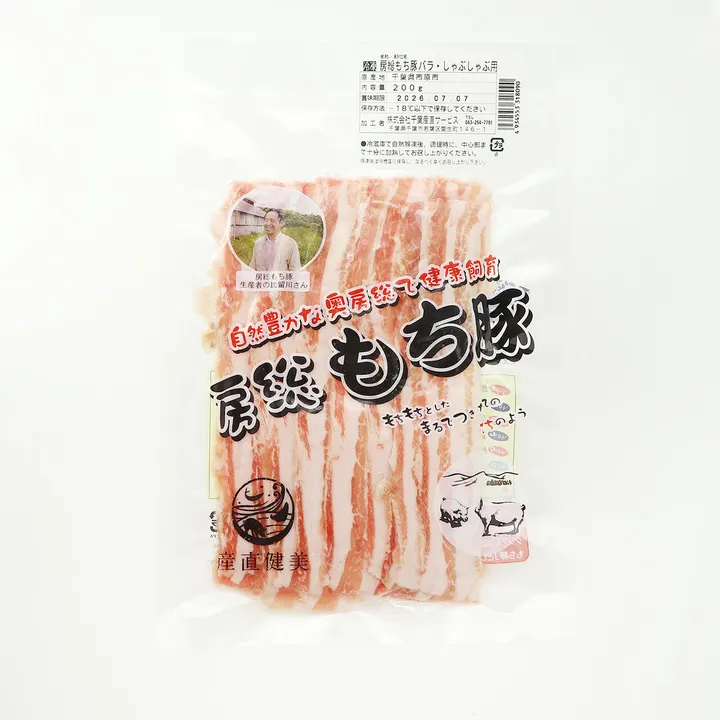 本品は冷凍品です (各注文の商品発送時に送料を設定) ※配送・送料の下部「配送・送料に関する補足」をご確認ください -------- 「房総もち豚」 クセがなく、脂に甘みがあり、 *「塩だけで十分おいしい」*と感じていただける市場流通の少ない上質な豚肉。 一農場限定・一頭買い。千葉産直サービスの自社工場で最終加工。 ◇ 生産地 千葉県市原市 ㈲比留川畜産 ◇ 加工者 千葉県千葉市 ㈱千葉産直サービス その脂はクセがなく、甘味さえ感じる。 塩味だけで十分においしいほど味わい深い。 豚肉が苦手な人にも「この豚肉なら食べられる!」と喜ばれております。 クセや臭みが無く甘味のある脂身は「食べる脂肪」としてもおいしいので料理に活かしたくなる良質なもの。 また、鮮やかな綺麗な色と、きめ細かいもちもちとした肉質と上質な旨味のある赤身も特徴です。 < 豚バラのしゃぶしゃぶ オススメの食べ方 > 房総もち豚の魅力は、まず脂の質。 このバラ肉は「この豚肉なら食べられる!」 そんな声をいただく部位です。 しゃぶしゃぶ用は、薄くスライスしているため、 さっと火を通すだけで脂の甘みは濃厚、後味は驚くほどさっぱり。 定番鍋用以外に、焼きしゃぶサラダ、冷製豚しゃぶサラダ、豚しゃぶの野菜巻き等に。 房総もち豚が「選ばれる理由」 ● 一農場限定。家族経営だから行き届く目 規模が大きくなると、生産の効率化や作業の合理性が優先されてしまいますが、当社は比留川さん(市原市・比留川畜産)一農場に限定。小規模だからこそ行き届く目が生む品質があります。作り手と加工者、消費者の持続可能な健全な営みを大切にしています。 ● 目配り、気配り、愛情かけて育てる 「彼ら(豚)の身になって」ストレスを与えない様に日々注意深く観察し、豚に接しています。 豚と向き合う姿は、まるで会話をしているかのような、生産者の比留川さん。生き物としての豚への接し方を何よりも大切にされています。 ● 約80日齢以降、飼料には薬剤不使用 子豚時、病気予防の抗生物質以外、成長段階の約80日以降は抗生物質は一切飼料に加えません。またEM菌やハーブ等を加えた独自のこだわり飼料で約190日かけて育てています。 ● 一頭買い、自社工場で最終加工 比留川さんが大切に育てられた豚を、当社が一頭単位で責任仕入れ。 千葉産直サービスの自社工場で品質を見極めながら最終加工してお届けします。顔の見える関係だからこそ守れる品質があります。