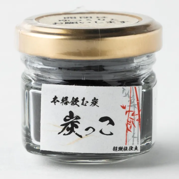 【 飲む竹炭「超微粉炭っこ」とは 】 *なぜ炭を食べる?飲む? 現代人の体は、不規則な食生活や日常のストレスによって酸化しやすい体質になっています。まずは、体内の有害物質を排除・除去することが大切で、それをせずにいくら良いサプリを摂取して体調を整えようとしても効果は期待出来ません。炭を体内に取り入れる事で活性酸素を吸着してくれる働きがあり、不足しがちなミネラルも豊富に摂取出来るので、疲れた体をリセットし、心身ともに健康に向かうことが出来ます。医療現場でも有毒治療などの吸着に活性炭治療が行われています。 *炭なら何でもよいのか? 答えはNo、樹木も同じ人間と同じ生き物ですから、大気や土壌汚染によりあらゆる物質を樹木内に溜め込んでいます。良い炭を生産するには、原料の選定はもちろん燃焼温度や燃焼時間が重要になってきます。弊社では原料となる竹も、自生している土壌環境を見定め、栽培・伐採から炭化・粉砕まで自社製造の100%国内生産しています。特殊なコンピューター制御された炭化路で炭化した炭は、不純物がなく炭素率96%という高純度の炭。残り4%はミネラルと酸素。ヒ素、鉛、カドウミウム、水銀などの検査も基準値を合格しております。粉炭の性質はアルカリ性のため、体内に取り入れることで酸性に傾いた酸化体質を中和してくれる働きがあります。 【 飲む竹炭「超微粉炭っこ」飲むメリット 】 ⚫︎ミネラル補給! 竹炭はミネラルの宝庫 不足がちなミネラル補給で天然のサプリ ・暴飲暴食気味な方へ ・健康美に興味のある方 ・お酒が好きな方 ⚫︎体内の有害物質排出! 驚くべき吸収力!排出力効果! 吸収力は木炭の3倍以上! ・健康に長生きしたい方 ・お肌のあれが気になる方 ・体内に溜まったものを出したい方 ⚫︎体の動きを活性化 有害物資を排出し、体内循環を改善することで、 体の動きを活性化していきます! ・腸活に興味がある方 ・便秘気味の方 【 飲む竹炭「超微粉炭っこ」の特徴 】 ◎高純度竹炭100% 炭っこの構成成分は96%が炭素で、残りはミネラルのみ。 不純物を一切排除した純度により、安心して体内に 取り入れることが出来ます。 ◎徹底した製造工程 通常の炭は土釜で焼きますが、弊社の炭は特殊な炭化路を 使用しています。燃焼温度・燃焼時間を完全コンピューター 制御し、燃焼ムラも最小限に仕上げることが出来ます。 皆さまの体内に入れる物質ですので不純物を取り除く ために研究開発を徹底的に行い、一貫した自社製造に よって品質管理をしています。 【 飲む竹炭「超微粉炭っこ」の飲み方・食べ方 】 付属のスプーン1杯を目安に ・水(200〜500ml)に混ぜて飲む ・コーヒーに混ぜて飲む ・アルコールに混ぜて飲む ・スープ、お味噌汁に混ぜて飲む ・ヨーグルトにかけて食べる ・様々なおかずに混ぜて食べる ・商品名 : 超微粉炭っこ ・名称 : 竹炭 ・原材料 : 国産竹 ・内容量 : 8g ・保存方法: 直射日光、高温多湿を避け、冷暗所 ・製造者 : 大輝有限会社 ・賞味期限: 瓶裏面に記載(製造から1年半) 【 栄養成分表示 】100gあたり・推定値 ・エネルギー 334kcl ・炭水化物 81.1g ・タンパク質 1.9g ・脂質 0.2g ・食塩相当量 0.023g ■ JANコード 4571559560803