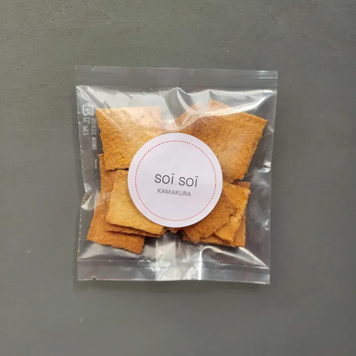 ★こちらは予約商品です。発送日が確定しましたら、お知らせ致します。 〇国産生オカラをたっぷり使用。ポリッと、ザクッとした食感 〇小麦粉不使用のグルテンフリー 〇動物性原料を使わないヴィーガンおやつ 〇食物繊維もたっぷり。1袋に5.9g 〇廃棄されることも多いオカラをアップサイクル。サステナブルな意識の高い方にもおすすめ 〇プチギフトにぴったりなサイズ 【栄養成分】(1袋30gあたり) 熱量 135kcal タンパク質 3.37g 脂質 1.89g 炭水化物 19.16g 食物繊維 5.94g 食塩相当量 0.01g *日本食品標準成分表2020年版(八訂)を参考に算出 鎌倉の海や山が100年後も同じように美しくあってほしい…そんな思いで、廃棄されるオカラ(*1)を使うことで少しでも食品ロスを減らし、また環境負荷の低い大豆製品(*2)を多くの方に食べてもらい、少しでも気候変動による自然への影響を減らしたいと始めたおやつです。 お豆腐屋さんから仕入れたオカラでつくった、誰でも美味しく召し上がっていただけるクッキーとクラッカーの中間のようなお菓子です。試行錯誤の末、誕生しました。朝食や小腹が空いた時のスナックに、お酒のおつまみにもピッタリです。 *1;おからは豆腐や豆乳を作る際にできる栄養たっぷりの副産物ですが、食用にはほんの1%しかならず、飼料にもいくらか活用されていますが、廃棄される量も多いという調査があります。 *2:たとえば1㎏の肉を生産するのに、飼料として10㎏の大豆が必要だと言います。肉は大豆に比べると、生産するのに何倍もの二酸化炭素を排出します。 ※パッケージ素材や形が変更されることもあります。紙またはプラ袋、テトラ型など、ご要望がありましたらご相談ください。